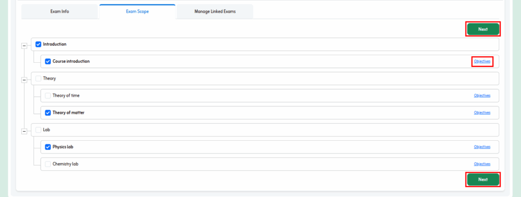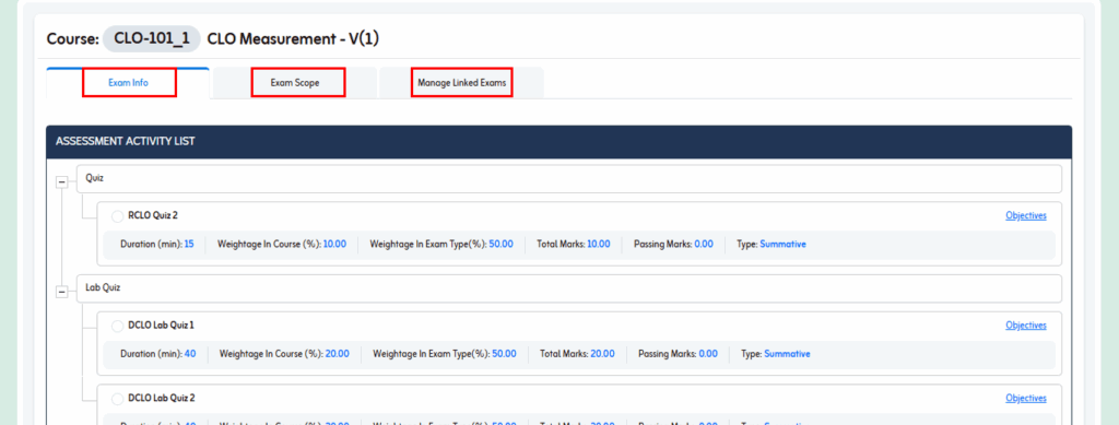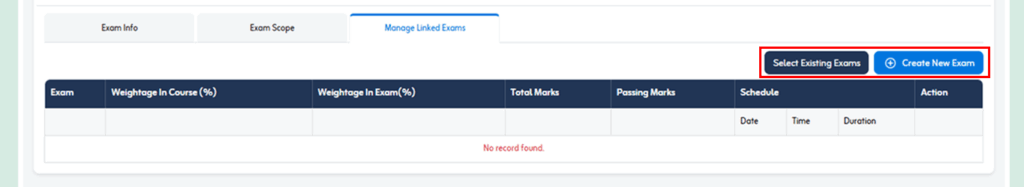 • There are three tabs here. “Exam Info”, “Exam Scope”, and “Manage Linked Exams”