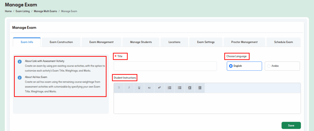 After completing “Exam Info”, the other tabs in “Manage Exam” are the same as those used when creating a single exam.